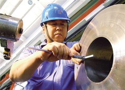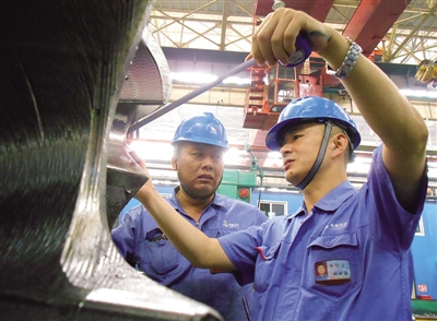 国内首件直径3.6米、毛坯重量达30余吨重的冲击式转轮整体加工技术,在哈电公司加工历史上还没有过。技师刘宏海(右)、程国太两个人可是下了功夫,他们自制了工装和刀具,使刀具强度达到了极限,切深达730毫米,多种加工手段一次呵成,加工成成品后,部件将只有13吨多。