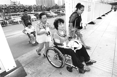 李文君(左)推体验员通过残疾人通道 在常人看来,这是一个残缺的世界,黑白的世界。可在李文君的眼中这却是一个童真的世界,多彩的世界。这里的每一名残疾孩子都让她心存一份感动。身为残疾人的李文君用勤劳与智慧为残疾人创造出了一个温暖的大家庭。