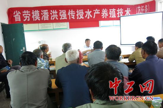 多年来,潘洪强积极响应溧阳市总工会号召,不断开展劳模三走进活动,至2013年底,他在全国各地,已培训鱼、虾、蟹等淡水水产养殖户10000余人次,免费赠送他自己编著的各类水产养殖的书籍15000余册。今年2月起,他不断走进溧阳市和周边地区的镇、村,为水产养殖大户免费举办培训,前不久他走上溧阳天目湖中专的讲坛,以“学习是生命力的源泉”为题,从自己由一个初中毕业生,经自学成长为具有研究生学历的研究员级高级工程师入手,为300多名师生上了生动的一课。本次培训是他今年的第11次,到目前他已培训2000余人次,为养殖户免费赠送各类水产养殖的书籍3000余册。(秦益明)