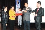 华锡大厂水电后勤服务分公司总经理李秀成(右二)在给幸运职工念送祝福语。
