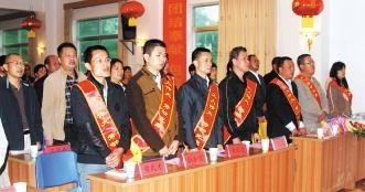 与会领导给劳模们佩戴绶带,敬送鲜花,并合影留念。