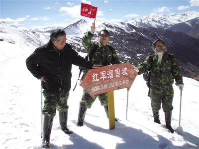 2004年第一次重走长征路活动中,“文化长征队”来到“红军溜雪坡”(左一为时年67岁的李绿森)