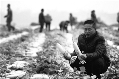 潼南桂林街道双坝村党支部书记朱席武在菜地里了解菜农们的萝卜收成情况