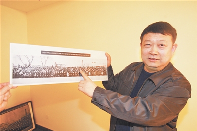 ■樊荣福的二儿子樊整风介绍父亲参加劳模会并接受党和国家领导人接见时的场景 本报记者杨磊涛摄 “你看,这是毛主席,以主席为基准,后三排向右数第八个人就是我的父亲樊荣福,当时他作为全国铁路先进生产者代表接受中央领导接见,为了这张照片,我们跑到了太原机务段,从另一位已经逝去的全国劳模的子女手里,找到这张珍贵的照片,准备将其作为传家宝,当成燕赵好家风继承发扬下去。”4月7日,已经退休在家的石家庄手表厂职工樊怀玉面对记者,激动地说。