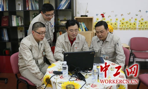 王军在创新工作室与业务骨干探讨装备技术改造相关问题。中工网记者王莹摄