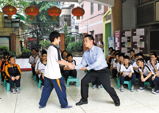 羊城晚报讯 记者赵晨、实习生萧燕仪、通讯员刘迪报道:广州市公安局荔湾区分局便衣侦查大队副大队长邬松君前天参加了在北京召开的全国庆祝“五一”暨表彰劳模大会,被授予“全国先进工作者”荣誉称号。昨天,载誉而归的他来到广州荔湾区的立贤中学,与数十名中学生探讨校园安全问题,现场模拟犯罪情景,手把手教学生遇到“坏人”时怎样快速解围。