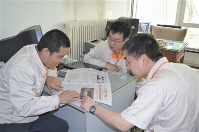 徐宝军的徒弟们在看本报 徐宝军是沈阳第一机床厂车铣复合产品线技术部客户工艺室数控调试车工,今年被评为全国劳模,并参加了4月28日召开的全国劳动模范和先进工作者表彰大会。4月29日,记者来到沈阳第一机床厂徐宝军所在的班组采访,发现《辽宁职工报》格外抢手,徐宝军的徒弟比他还激动,抢着看报纸上关于劳模大会的报道。他们一边看报纸,一边兴奋地猜想他们的师傅上台领奖时是什么心情。