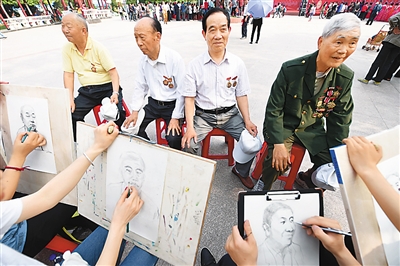 4月28日,合肥学院艺术系的学生正在为黄名君等劳动模范画像。(解琛/人民图片)