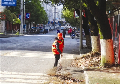 到了春季,县城满街的香樟树因新陈代谢,每天树叶像下雪一样一片一片地落下,前边刚扫过,后边又有树叶落下,她又得回过头重新再扫。雷雨交加,树叶落在水淋淋的地面上,更是增加了不少的工作难度。面对困难她不泄气,同时在清扫保洁作业技巧和工作时间的合理安排上,虚心地向老同事请教、学习和交流。见邻居地段的工友因年龄大,行动较慢时,她都会主动过去帮助打扫。有时见有工友身体不舒服,更是主动代劳。她摸索总结出“清扫经”:“重点路段勤打扫,人多之处见空扫,垃圾多时突击扫,饮食摊旁轻轻扫,灰尘多时压着扫。”这清扫经一念就是十年,每天清扫道路面积8000多平方米,一天作业下来,经常是累得满头大汗、腰酸脚痛。天天念,天天干,干不好,就寝食难安。她手执扫帚十年,扫秃了的扫帚共计700多把。