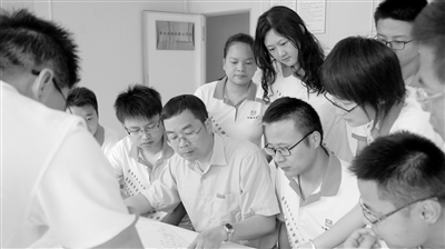 李政(左三)和创新工作室成员一起研究图纸。(资料图片)