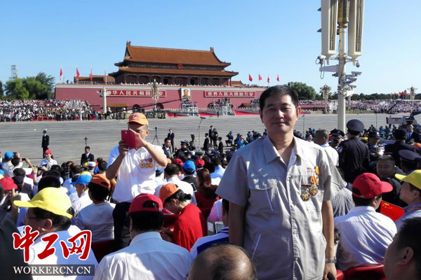 河北钢铁集团唐山钢铁集团有限责任公司首席操作技能专家郑久强刚到观礼台,就拉着一身工装的新疆油田公司勘探开发研究院开发所副总地质师木合塔尔,以天安门为背景,让别人帮忙拍下了一张合影。