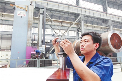 正在测量加工工件的刘新安。(摄影/黄正伟)