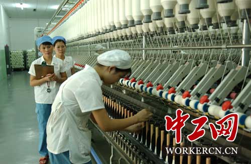 浙江春江轻纺集团 胡福秋在生产现场测定员工技术水平