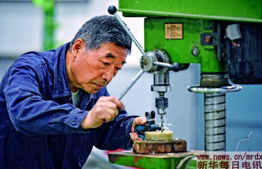 退休返聘的全国劳模李晏家在鞍钢焦化总厂职工实训室制作实训工具(4月24日摄)。新华社记者 姚剑锋 摄
