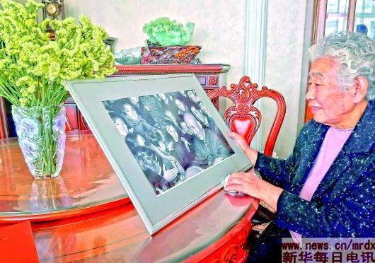 孟泰女儿孟庆珍向记者展示父亲孟泰的照片(4月23日摄)。新华社记者 王炳坤 摄