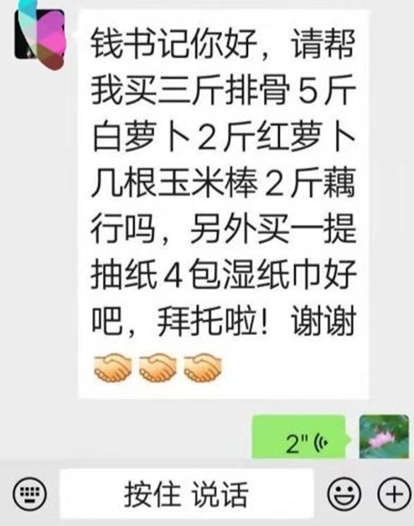 “钱书记你好,请帮我买三斤排骨5斤白萝卜2斤红萝卜几根玉米棒2斤藕行吗......”