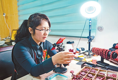 夜幕降临,贵州省铜仁市万山区万山镇一处临街小店内,透着光亮。店长华茜正对着手机,在直播间里介绍朱砂文创饰品:朱砂摆件、戒指、手串、绣着花纹的朱砂包……