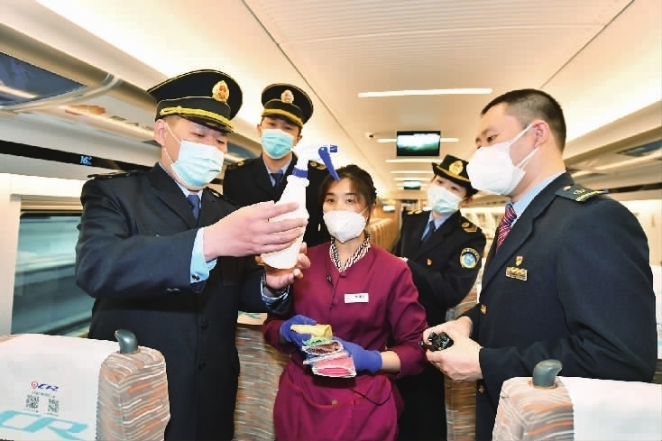 卢玉川(左一)在列车车厢进行防疫检查。张磊/摄