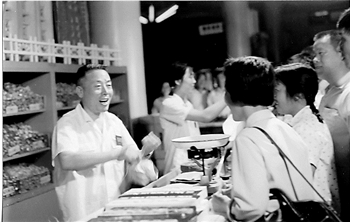 张秉贵,原北京百货大楼售货员,1959年全国劳模。在物资紧缺的年代,北京百货大楼每天要接待大量顾客,糖果柜台前经常排起长队。张秉贵发现,称糖和算账最耽误工夫。为此,他苦练称糖上手抓,最终练成了“一抓准”的绝活,大大减少了顾客排队时间。
