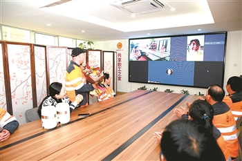 “罗姐,别转镜头啦!快给我们看看你的大奖章!”工友林宇迫笑着嚷道。罗祥英把手机镜头对准了自己的胸口,金灿灿的奖章出现在共享职工之家的连线大屏上,连线现场里传来了欢呼和掌声。