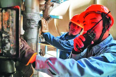 技术员于江涛(右)在为装置调整炉温。光明图片