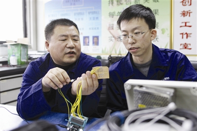 齐名(左)正指导杨殿飞研究新技术 记者毕春华摄