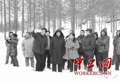 局长徐成立(左四)向中、德、印林业专家现场介绍木兰林管局森林经营现状