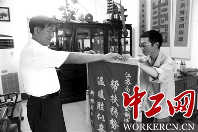 图为受助者给马全章(左)送锦旗