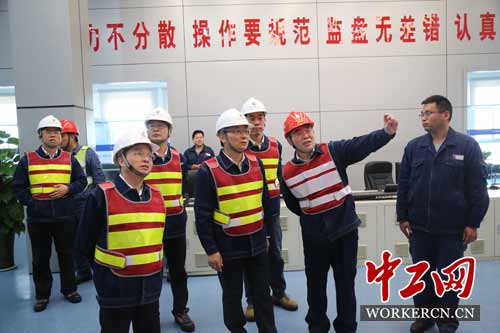 郎建国(右二)在集控室向上级领导介绍安全生产及经营情况