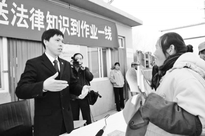 图为时福茂在普法现场为农民工讲解劳动法律常识。(资料图)