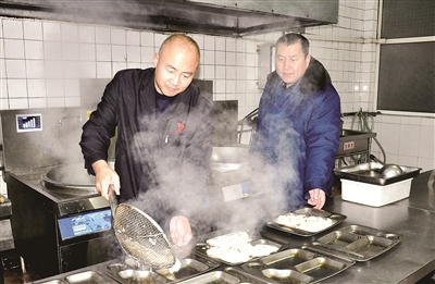 苗海波(左)将给职工煮好的饺子盛到盘中