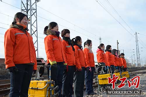 “谁说女子不如男”。清一色橘黄的工装、黄白相间的胶鞋,辉映着12名女职工的身影,成为大秦线上一道靓丽的风景。一台探伤仪50多斤,每天上线一走六七公里,光避车上下道就得二十几回。干过探伤的人都知道其实这活计长年风吹日晒,又苦又累、休假不规律,作业时间长,就餐没准点,男职工都望而生畏的活儿,她们却勇敢的承担了起来。哪怕夏天达到35~36度的高温天气,她们也坚持至少每月探伤20天,完成道岔探伤75~80组的高强度工作。因为她们有着一个信念“当兵时保家卫国,在工作保大秦畅通”。为了不掉队、不拖后腿,她们开始学技大练兵。现任工长谢小伟,当时对仪器不熟悉,出波辨别不清,判伤不果断,为练就一手精,她留心观察作业中不同程度的伤损;在师傅指导下,进行各种探头的装配,并结合仪器在试块上反复练习,大胆判定。终于掌握了出波的辨别及位置变化。每次出工前,严格班前预想,严禁设备带病上道。作业中执行“一看波形显示、二看探头位置、三看接头状态”操作标准,从不放过每一个疑点。严格的管理增强了作业人员的责任心,减少了回检复查,杜绝了漏检现象。婚姻有七年之痒,班组也有七年之困惑。2014年,正是柳村女子探伤工区成立的第七个年头,高强度的工作、家居异地的思乡情绪,这些让她们产生了畏难的情绪和动摇的念头,有人开始满腹困惑,有人开始想要离开。但有一个声音在告诉她们“军营里是个好兵,干探伤也不当孬种”。当初军营中的特种兵、陆军、空军、海军、武警,根植于血脉中的军魂使她们坚定了信心和决心,用军魂激发巾帼精神。为此,她们开展了以“学理论、学规章、学技能、比技术”为主要内容的 “三学一比”大练兵活动,采取学习培训、技术党课,练功比武等多种形式,认真学习本职业务,提前掌握本岗位规章和技能,在推广新技术、新设备、新工艺的使用上起到了关键性的辐射和带动作用。三年来工区的技术素质突飞猛进,共有三名女工参加段专业技能竞赛,其中杨洁、谢小伟都在竞赛中获得优异成绩,实现了技术比武“零”突破。创建了以火车头奖章获得者袁晓英命名的《晓英劳模创新工作室》,着力开展专业技术攻关活动,共攻克技术难题5项,其中袁晓英的《图谱分析确定现场判定法》重点课题的突破,完善了探伤检测手段,有效的提高了生产效率。