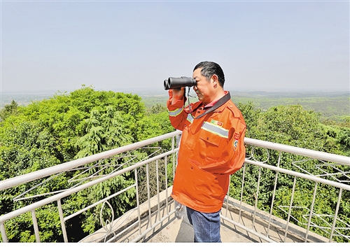 韩明道在望火楼上瞭望林场。长期的护林工作,让韩明道练就了一双“火眼金睛”。晴好天气时,他用望远镜能看到15公里以外的火情,极好天气时可以看到30公里。(中经视觉)