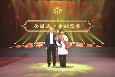 马秀华(右)荣获全国五一劳动奖章接受表彰