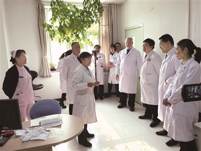 马秀华(前排中)向美国专家介绍专家门诊情况