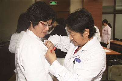 马秀华(右)为医院星级服务人员授牌
