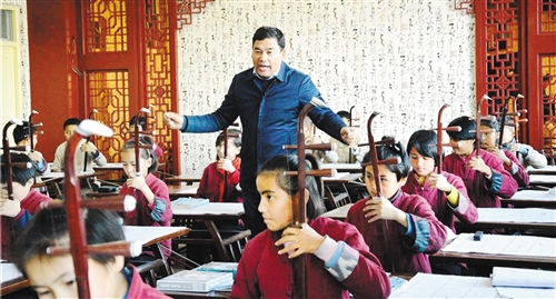 库尔班·尼亚孜(中)在给学生们上二胡课。 (资料图片)