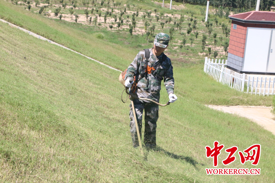 李涛在修剪堤防草皮。中工网记者 朱晶晶 摄