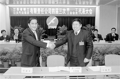 图为曹如明(右)代表工会与企业签订工资集体协商协议 蒋兮 摄