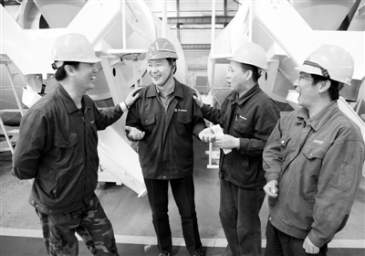图为周兵(右三)在车间与职工亲切交谈,了解职工的生产、生活情况。 张丙涛 摄