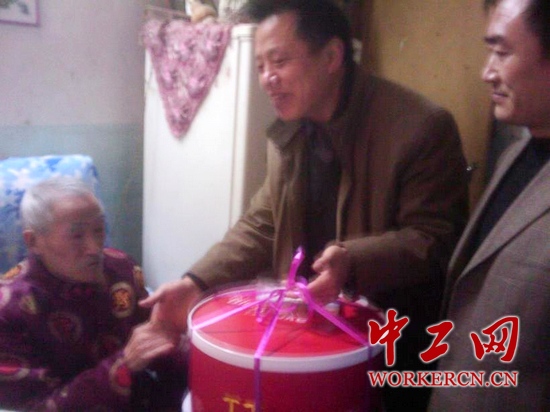 每逢基地七十岁以上老职工生日,李维广(中)总是提着蛋糕上门祝寿