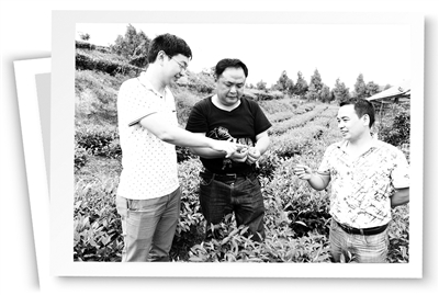 王明礼(中)在给工作人员介绍晏茶生长情况。 本报记者 王新伟摄