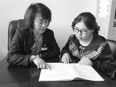 张明秋(图左)正在给职工讲解互助金的申请与给付条件。本报记者 史强宇/摄