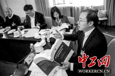 朱山委员结对帮扶纳雍县董地乡,他用自己的专长开展法律援助精准扶贫。在发言中,他还带来《脱贫攻坚涉农系列合同示范文本》,向委员们推广自己的脱贫攻坚经验。工人日报—中工网记者 王伟伟 摄