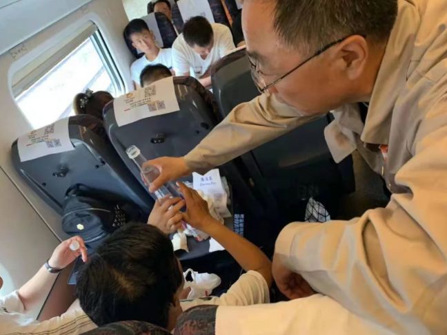 一位旅客冲到正在巡查服务的青年乘务员李铭面前,急切地讲述着小红的病况。列车长冯超闻讯,边赶往车厢,边通知列车发出寻找医生的广播。听到广播,车上有两名医生随后赶到施救,小红逐渐苏醒。