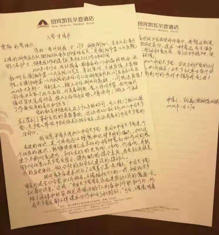 “作为一名护士,在得知武汉疫情危急时,我自愿报名前去支援武汉,感谢院领导让我有幸成为第一批支援湖北的137名医务工作者中的一员。请党组织在实践中考验我。”写下这份入党申请的刘盼,来自湖南师范大学附属湘东医院,年仅25岁。