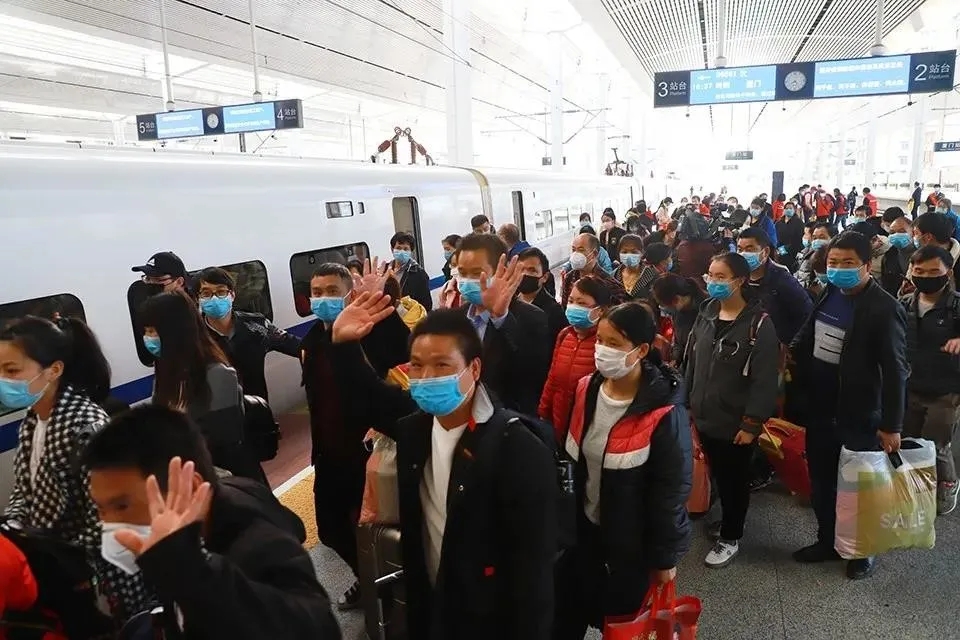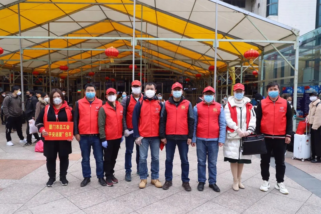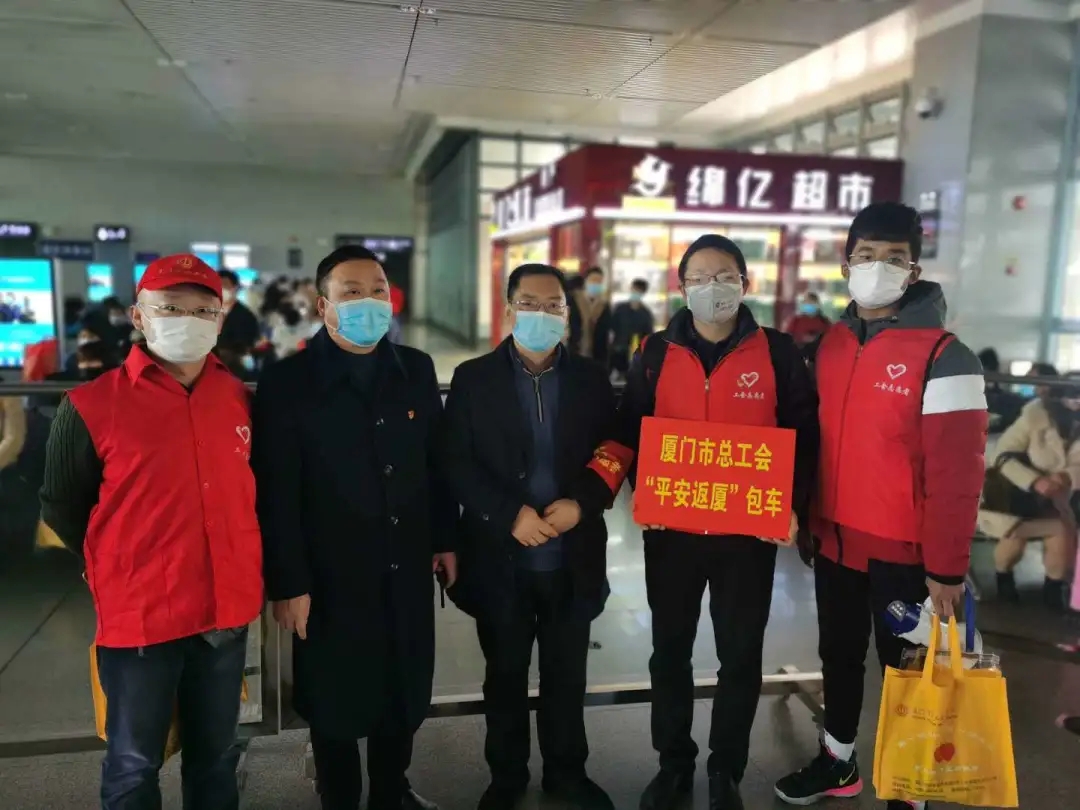 中工网讯 2月21日,431名职工搭乘厦门首趟包列动车从江西南昌、抚州回到厦门。为了迎接这批返岗职工,厦门市总工会派出6名志愿者提前一天分别到达南昌和抚州。