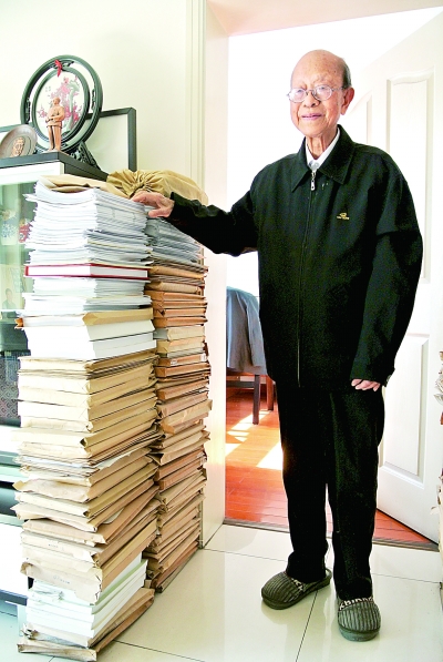 92岁高龄的江流从书房走出,房门两侧的五大摞书稿衬得他越发清瘦矍铄。