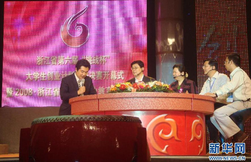 杨芳(右三)出席浙江省第六届“挑战杯”大学生创业设计比赛决赛开幕式(2008年5月30日摄)。 新华社发
