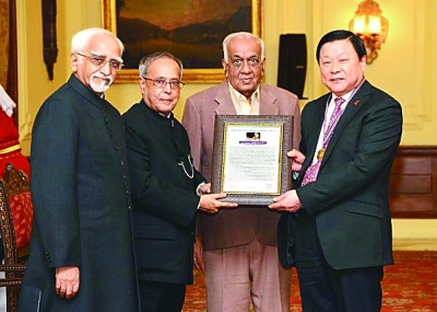 印度总统慕克吉(左二)为张国成颁发“国际甘地奖”。 资料照片